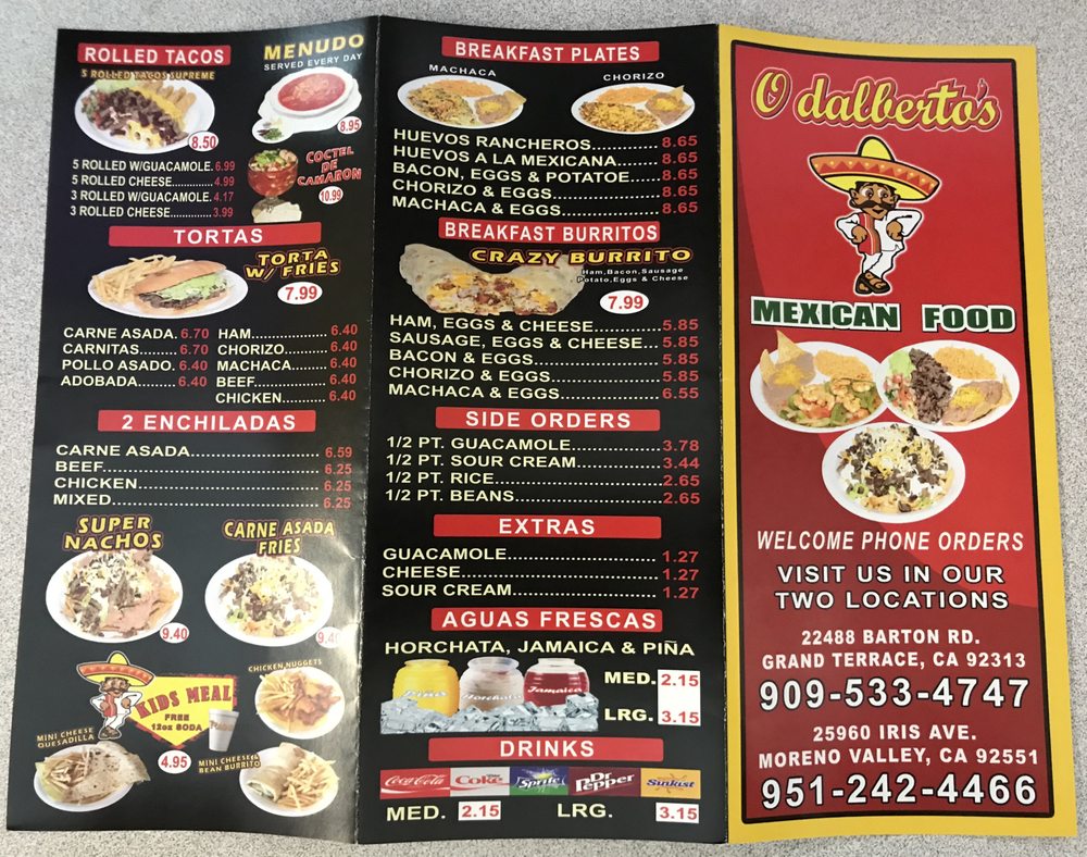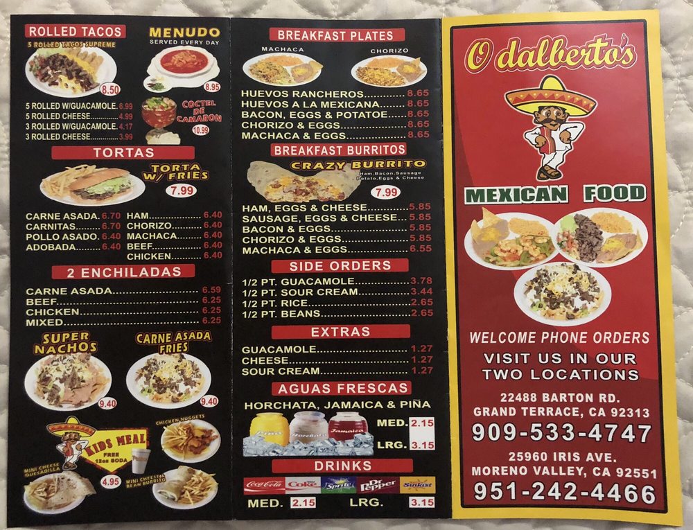 Introducing the menu at Odalberto's Mexican Food, located in Moreno Valley, CA, offers a diverse selection of Mexican dishes. The breakfast options include savory breakfast burritos like the Crazy Burrito with ham, bacon, sausages, potatoes, eggs, and cheese. For a heartier meal, try the Machaca and Eggs Plate or the Chorizo and Eggs Plate. The Antojitos section features tempting dishes such as Supreme Nachos, Surf and Turf Fries, and Enchilada Fries. Customers rave about the flavorful food and generous portions. The restaurant also provides delivery, takeout, and catering services. Whether you're craving traditional Mexican fare or looking to try something new, Odalberto's Mexican Food offers a delightful culinary experience.